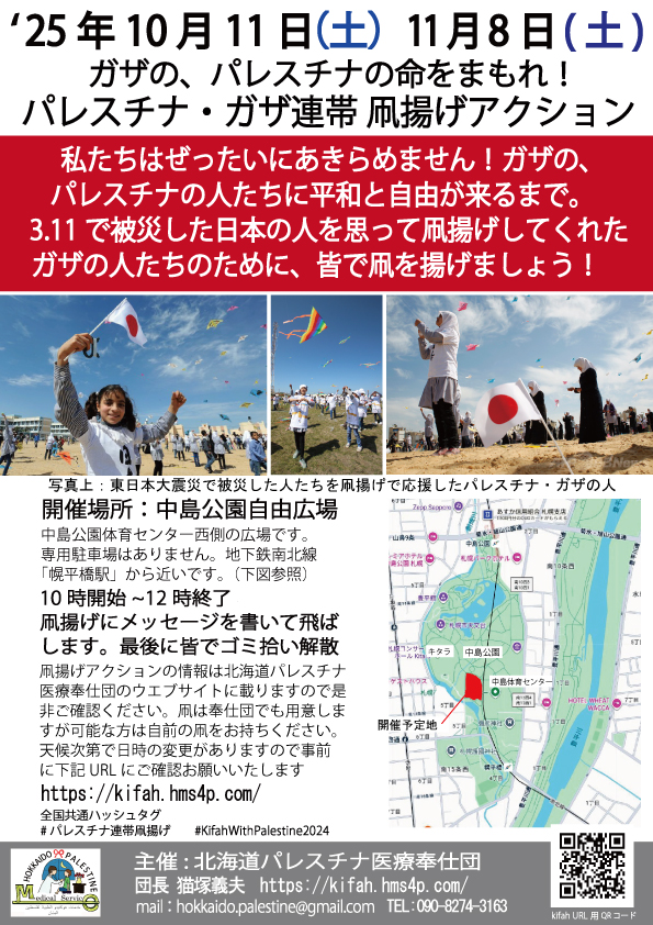 | 2025/11/08   | 「パレスチナの命を守れ」凧揚げアクション 日時 :2025年11月08日(土) 10:00〜 場所 :中島公園自由広場 内容 :凧揚げ 主催 :北海道パレスチナ医療奉仕団 |