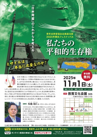 | 2025/11/01   | 2025憲法フェスティバル私たちの平和的生存権 日時 :2025年11月01日(土) 13:30〜 場所 :札幌市教育文化会館305(札幌市中央区北1条西13丁目)&オンライン 講師 :布施 祐仁氏(フリージャーナリスト) 参加費:無料 オンライン参加には事前申し込みが必要です こちらから 主催 :青年法律家協会北海道支部 |