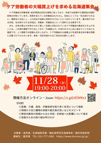 | 2025/11/28   | ケア労働者の大幅賃上げを求める北海道集会 日時 :2025年11月28日(金) 19:00〜20:00 場所 :オンライン Zoom 内容 :◎医療、介護、保育、学童保育を取り巻く状況について報告 ◎現場から見た職場の実態や組合員の思いなどのスピーチ ◎障害児教育の現場からみた市民・利用者への影響について発言 ◎改善のための取り組み呼びかけ 主催 :道労連/北海道医労連/福祉保育労北海道地本/建交労道本部 |