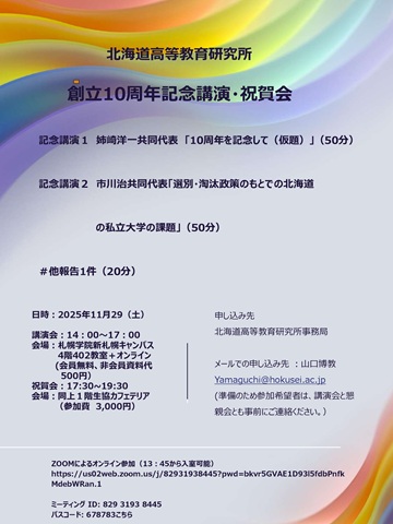 | 2025/11/29   | 北海道高等教育研究所創立10周年記念講演・祝賀会 日時 :2025年11月29日(土) 14:00〜17:00 場所 :札幌学院新札幌キャンパス4階402教室+オンライン 内容 :記念講演1 姉崎洋一共同代表 「10周年を記念して(仮題)」 記念講演2 市川治共同代表 「選別・淘汰政策のもとでの北海道の私立大学の課題」 他報告1件 参加費:会員無料、非会員資料代500円 申込 :事務局 山口博教氏までメールで(チラシ参照のこと、全て小文字です) 祝賀会:17:30〜19:30 同上1階生協カフェテリア 参加費:3,000円 主催 :北海道高等教育研究所 |