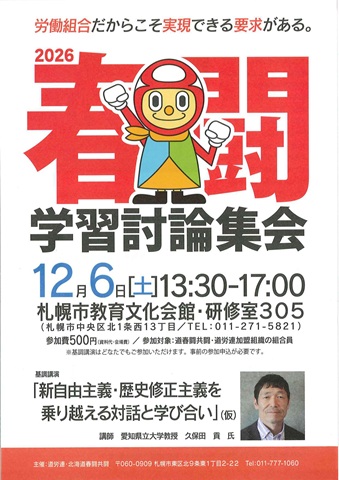 | 2025/12/06   | 26北海道春闘学習討論集会 道労連ニュース 日時 :2025年12月06日(土) 13:30〜17:00 場所 :札幌市教育文化会館305(札幌市中央区北1条西13丁目) 内容 :◆基調講演「新自由主義・歴史修正主義を乗り越える対話と学び合い」(仮) 講師 愛知県立大学教授 久保田 貢氏 ◆2026年春闘方針(案)提案 ◆3つの分科会 1)グループワーク・交流 2)実践講座「自分の職場で要求実現するための戦略を考えよう」 3)学習講座「春闘って何?どんなことからやればいいの?」 ◆全体会 各グループからのふりかえりなどを共有 申込 :2025年11月17日(月)までに申し込みが必要です 主催 :北海道春闘共闘委員会 |