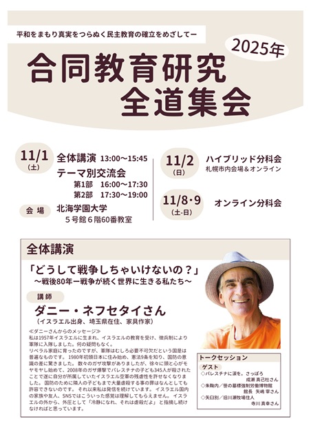 | 2025/11/01   | 2025年合同教育研究全道集会  リーフ 日時 :2025年11月01日(土) 13:00〜 場所 :北海学園大学豊平キャンパス5号館60番教室(地下鉄東豊線「学園前」3番出口) 内容 :全体講演 13:00〜15:45 「どうして戦争をしちゃいけないの?」〜戦後80年−戦争が続く世界に生きる私たち〜 テーマ別交流会 第1部 16:00〜17:30 〇教科書問題:2号館21番教室 〇子どもの権利:5号館E22番教室 〇しゃべり場withダニーさん:5号館E23板教室 〇不登校問題:5号館25番教室 第2部 17:30〜19:00 〇アイヌ民族:5号館E22番教室 〇たまごカフェ:5号館E23板教室 申込 :10月29日(水)まで 参加申込受付フォームはこちら 主催 :合同教育研究全道集会実行委員会 |