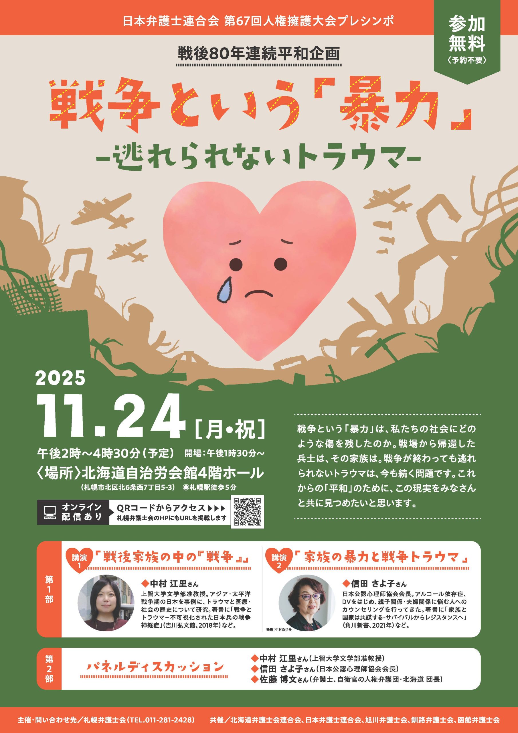 | 2025/11/24   | 第67回人権擁護大会プレシンポジウム 戦後80年連続平和企画 「戦争という暴力−逃げられないトラウマ−」 日時 :2025年11月24日(月・祝) 14:00〜16:30 場所 :北海道自治労会館4階ホール(札幌市北区北6条西7丁目)&オンライン配信あり 内容 :第1部 講演 中村江里さん(上智大学准教授) 「戦後家族の中の『戦争』」 第2部 講演 信田さよ子さん(日本公認心理師協会会長) 「家族の暴力と戦争トラウマ」 第3部 パネルディスカッション 中村江里さん、信田さよ子さん、佐藤博文さん(自衛官の人権弁護団・北海道 団長) 会費 :無料 主催 :札幌弁護士会 |
