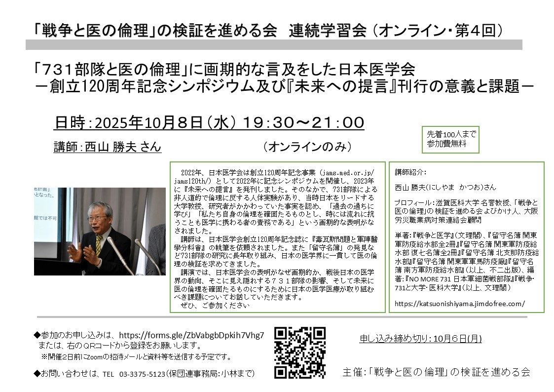 2025/10/08![]() | 「戦争と医の倫理」の検証を進める会 連続学習会 第4回 日時 :2025年10月08日(水) 19:30〜21:30 場所 :オンラインZOOM 講演 :「731部隊と医の倫理」に画期的な言及をした日本医学会 −創立120周年記念シンポジウム及び『未来への提言』刊行の意義と課題− 西山 勝夫さん(滋賀医科大学 名誉教授、「戦争と医の倫理」の検証を進める会 よびかけ人) 申込 :参加登録フォームはこちら 主催 :「戦争と医の倫理」の検証を進める会 |