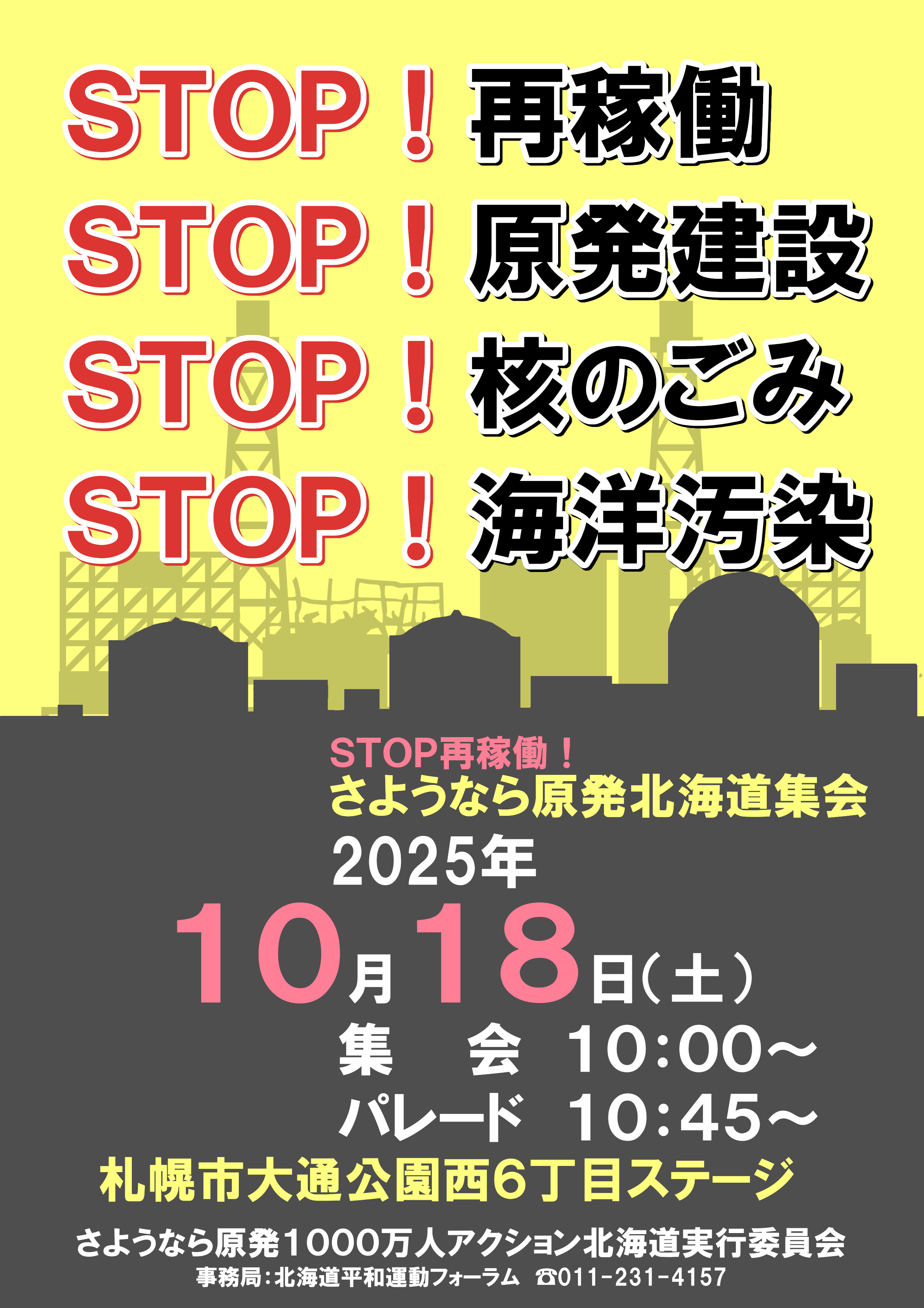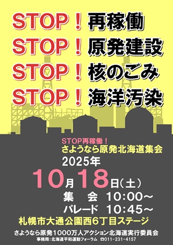2025/10/18![]() | STOP再稼働!さようなら原発北海道集会 日時 :2025年10月18日(土) 10:00〜集会 10:45〜デモ・パレード 場所 :札幌大通公園西6丁目 内容 :各団体からのスピーチとデモパレード 主催 :「さようなら原発1000万人アクション北海道」実行委員会 |