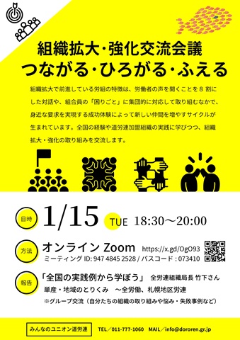 | 組織拡大・強化のための交流会議 日時 :2026年01月15日(木) 18:30〜20:00 場所 :オンライン Zoom ミーティング ID: 947 4845 2528 パスコード: 073410 内容 :・報告「全国の組織強化・拡大の実践例から学ぶ」 全労連組織局長 竹下さん ・各組織の「拡大・強化」のとりくみ紹介 (全労働、札幌地区労連) ・ループ交流 (自分たちの組織の取り組みや悩み・失敗事例などを交流) ・全体会 参加者からの感想とまとめ 主催 :道労連(北海道労働組合総連合)、札幌地区労連 |